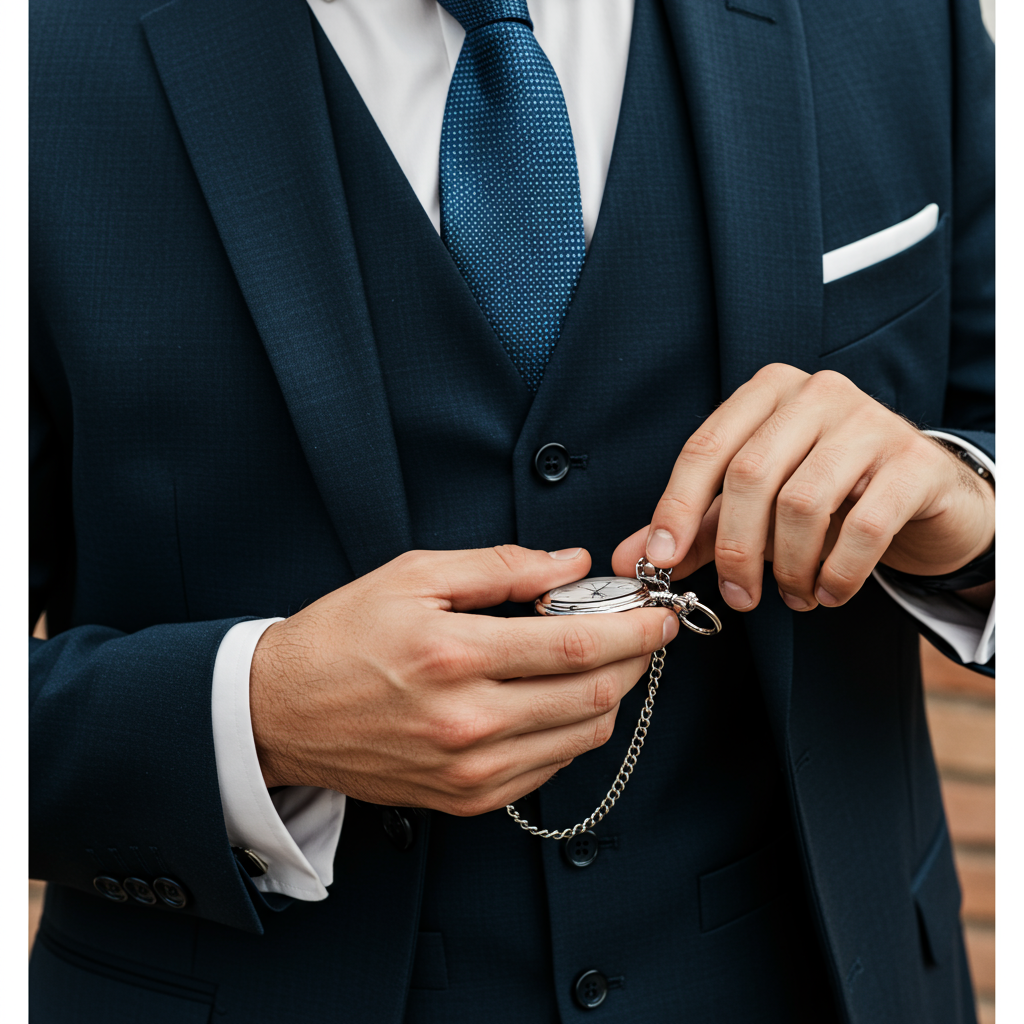 Dans sa forme la plus traditionnelle, la montre gousset s’associe au gilet (veste sans manches). La montre repose dans la poche du gilet (la poche inférieure est l’endroit habituel) et la chaîne est fixée par le T-bar dans l’une des boutonnières (souvent la troisième ou la quatrième à partir du haut). Cette configuration garantit que la montre est sécurisée et que la chaîne crée un arc élégant sur le tissu. C’est le summum de l’élégance pour les mariages, les galas, ou toute situation exigeant un code vestimentaire strict. Utiliser une montre gousset dans ce contexte est un signe de raffinement ultime, dépassant de loin la simple montre-bracelet en termes de déclaration stylistique.